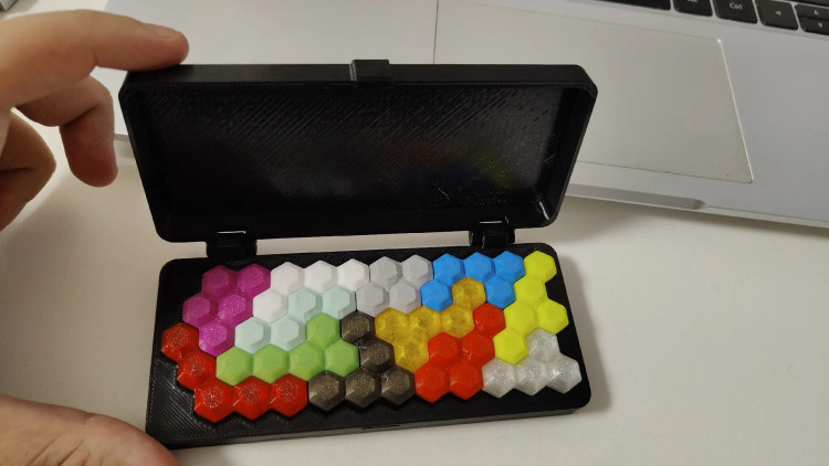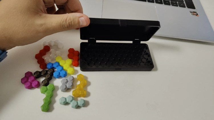 🔹️پازل شش ضلعی شامل یک باکس با خانههای شش ضلعی که 12 قطعه با اشکال و رنگ های مختلف روی آن به صورت پازل قرار گرفته است.